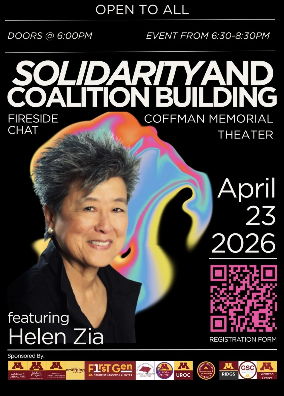On April 23, 2026, Helen Zia takes the stage at the Coffman Memorial Theater at the University of Minnesota for a fireside chat on solidarity and coalition building.